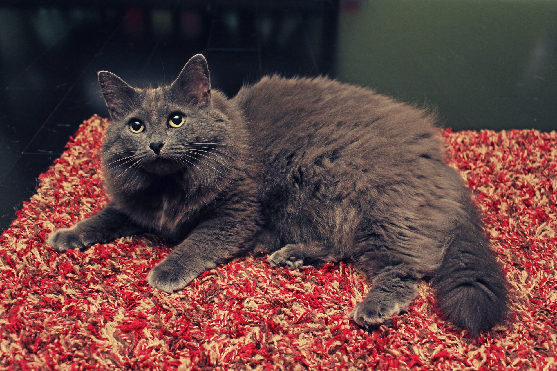 You’ve all met Missy before. She’s the cuddliest one of my cats. Also, as evidenced by the photos, playing with her means you get cat hair all over your floors. It’s totally worth the sweep job though. My red & brown shag rug is her favorite thing in my living room.